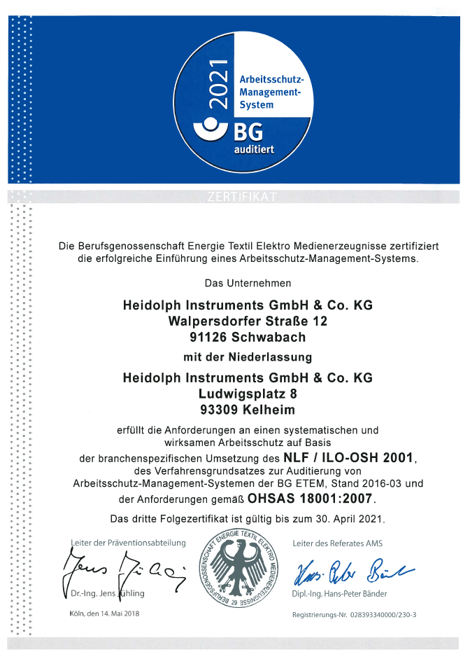 We believe that we can ensure the long-term and comprehensive protection of our employees with only one system solution. With the Occupational Health and Safety Management System (AMS) of the BG ETEM, we are in the position for the third time in a row to have the implementation of these systematic preventive measures certified. Thus, our company Heidolph Instruments in Schwabach, as well as the branch in Kelheim, meet the requirements for a systematic and effective occupational safety based on the NLF / ILO-OSH 2001. Particularly mentionable is the practical relevance of the occupational health and safety at work rated. As a premium manufacturer, we can conscientiously fulfill our responsibilities without losing any of the agility and quality in the international market environment.
