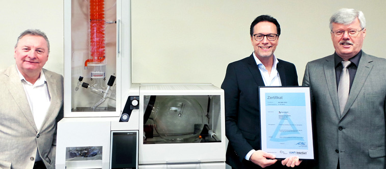 Presentation of the certificate by the LGA InterCert. From left: Mr. Sarré (Head of Quality Management and Technical Service), Mr. Jaenicke (Managing Director), Mr. Riegel (Ltd. Auditor, LGA InterCert)